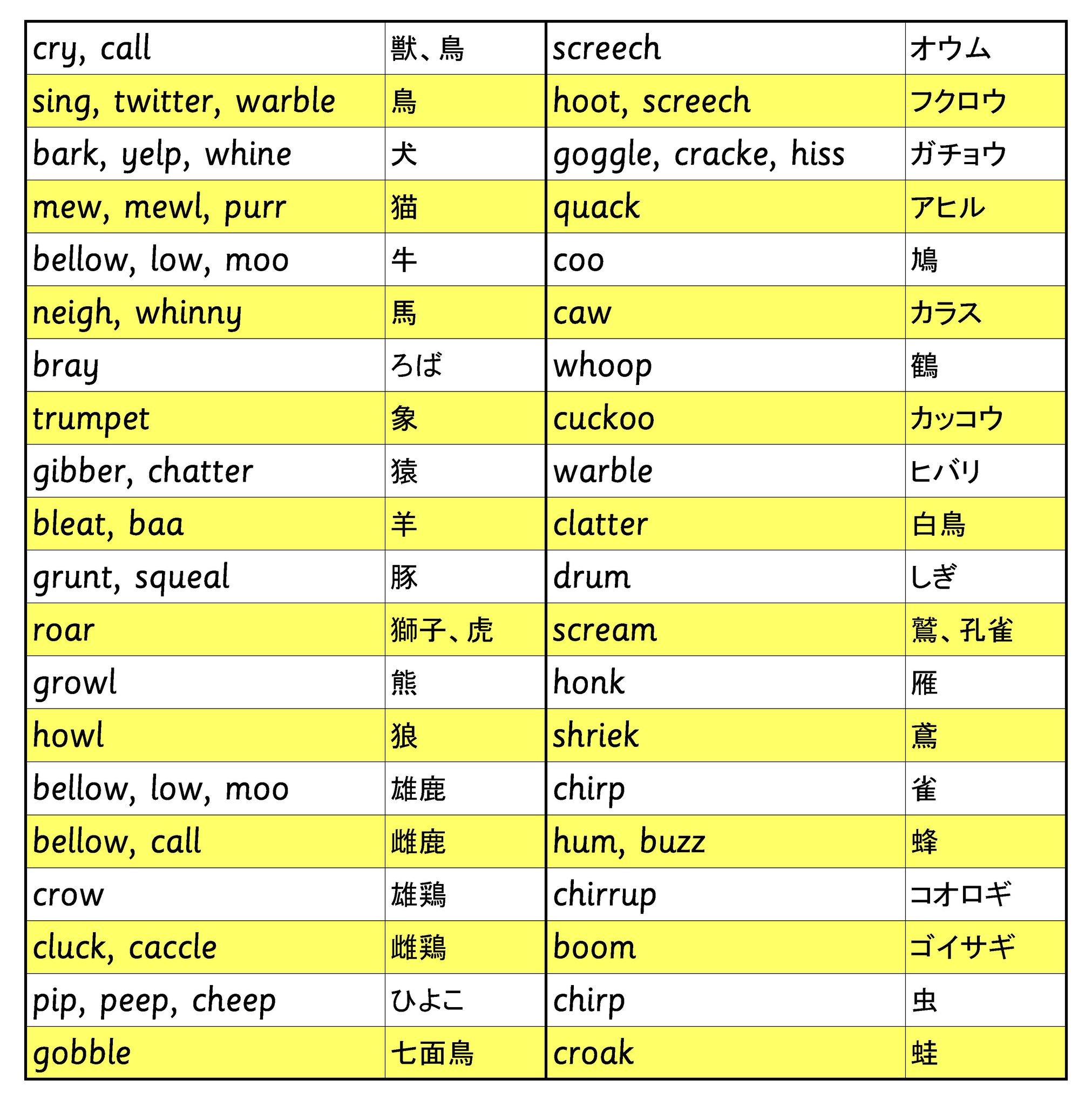 Early Bird On Twitter 擬音語は鳥や動物の鳴き声によく見られ 英語ではその鳴き声が動詞にも使われる 添付画像の表は楳垣実 日英比較語学入門 大修館書店 に基づくが 英語には実にいろいろな鳴き方があることがわかる 動物ごとに動詞まで違っているのかと感心