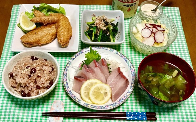 夕食 さわら味噌漬け 鶏手羽元唐揚げ 鶏ささみときゅうりのピリ辛